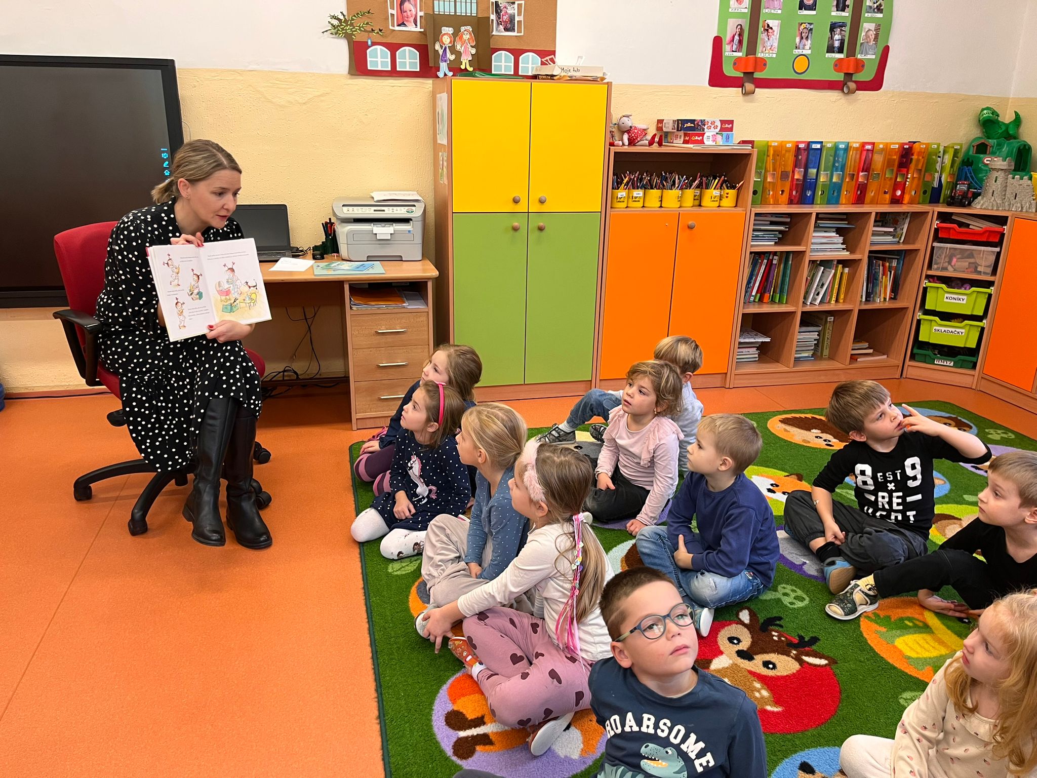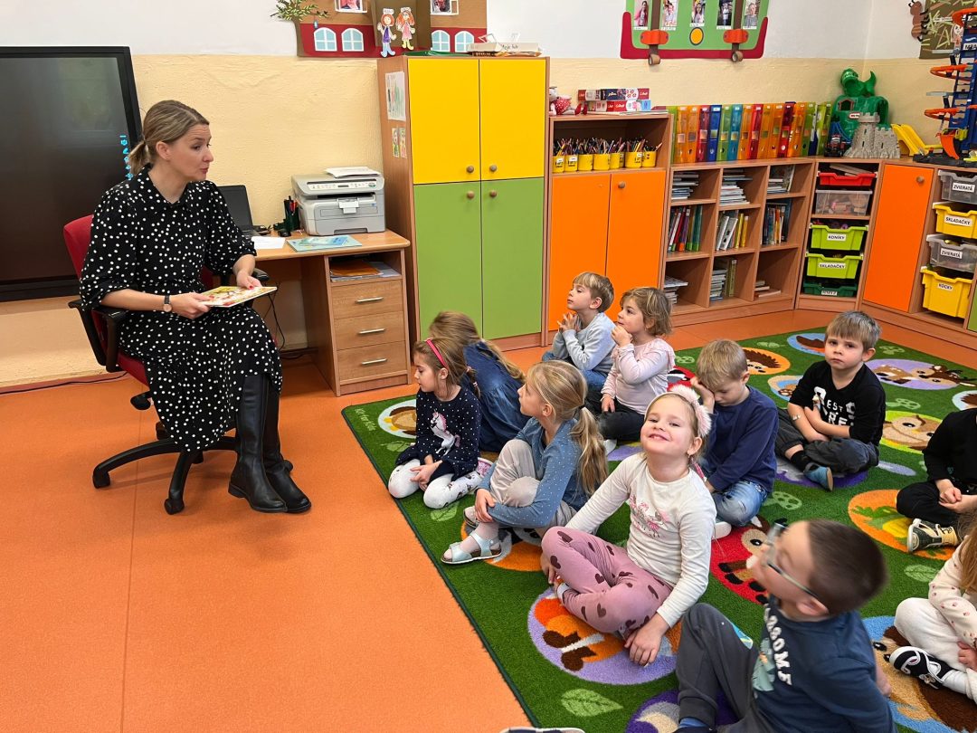 V jedno pondelkové doobedie sme so Sovičkami a Žabkami v priestoroch materskej školy s radosťou privítali našu pani riaditeľku, ktorá prišla deťom prečítať rozprávkový príbeh Sofia a Tekvička. Deti so zaujatím počúvali jej pútavé čítanie a sledovali prezentované ilustrácie. Po čítaní, ako malú vďaku, pani riaditeľke predviedli pieseň o repe, spojenú s jej pohybovým stvárnením. Na záver si deti tekvičku, o ktorej bol príbeh, aj nakreslili. Pani riaditeľke spoločne s deťmi veľmi pekne ďakujeme a už teraz sa tešíme na ďalšie pútavé čítanie!