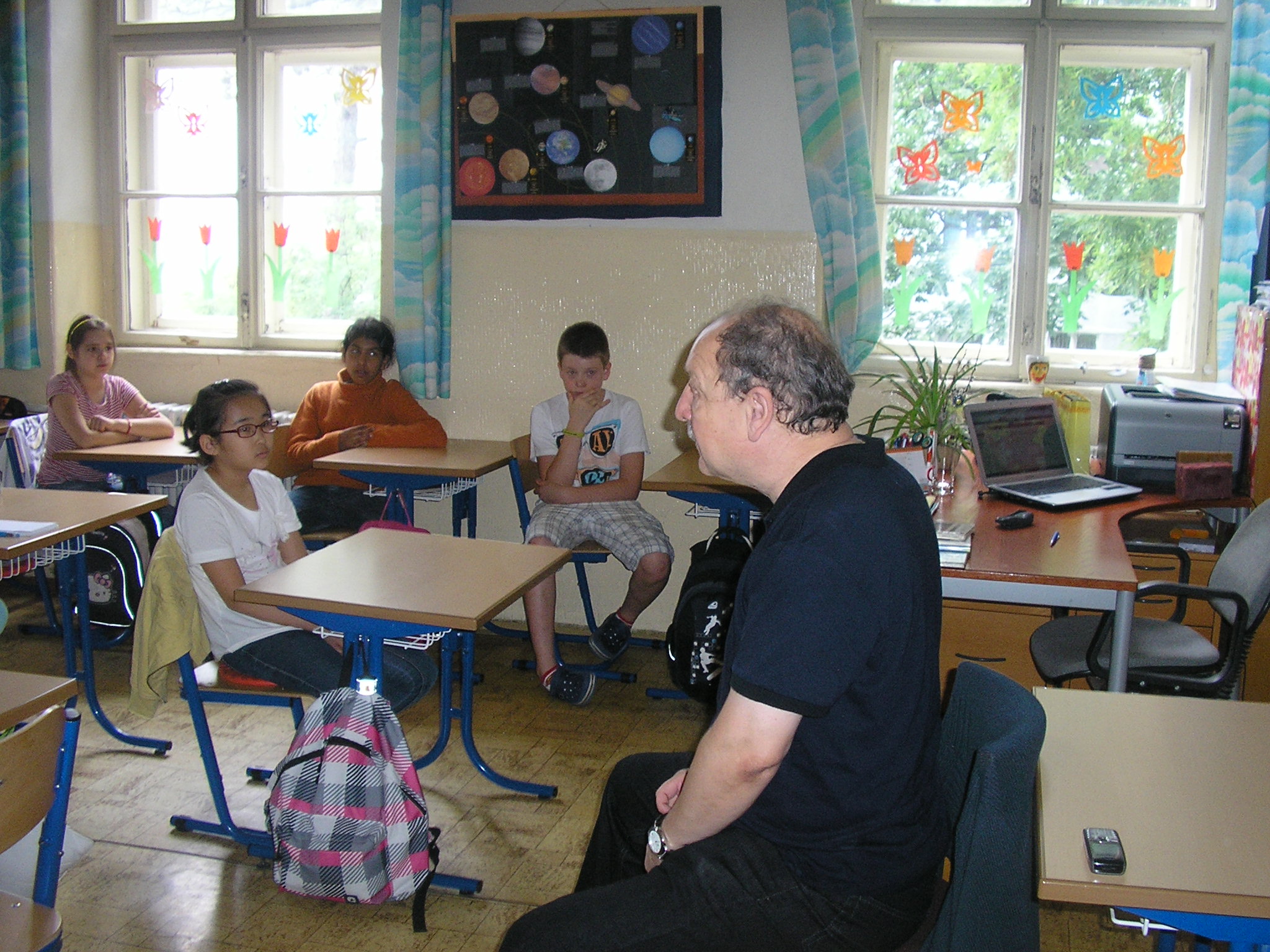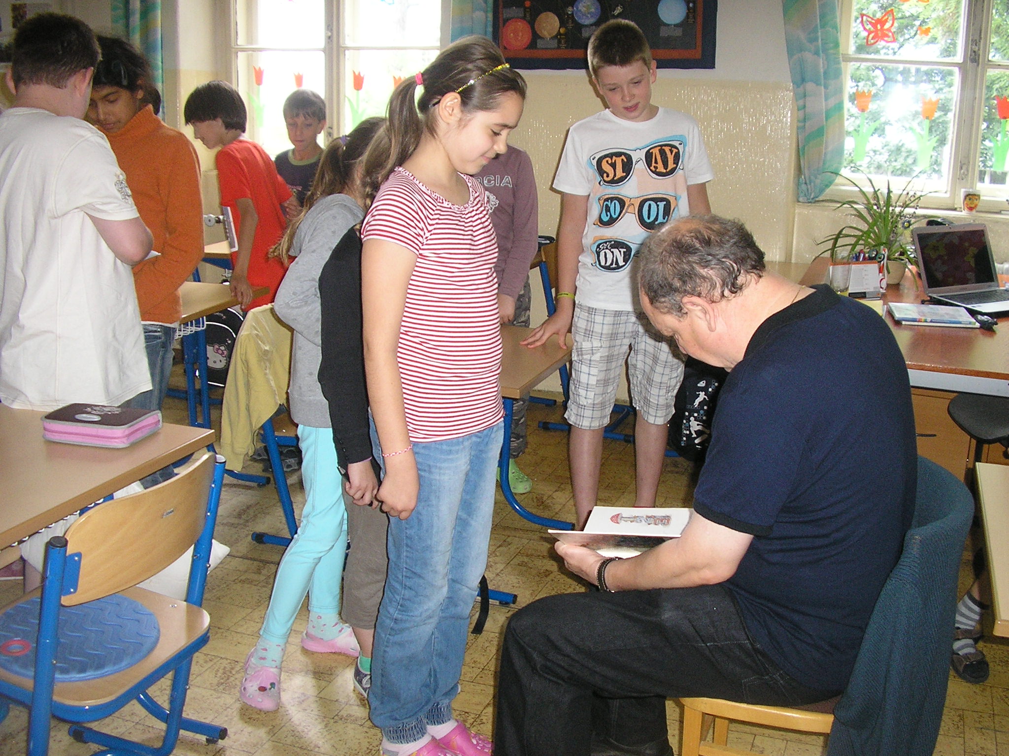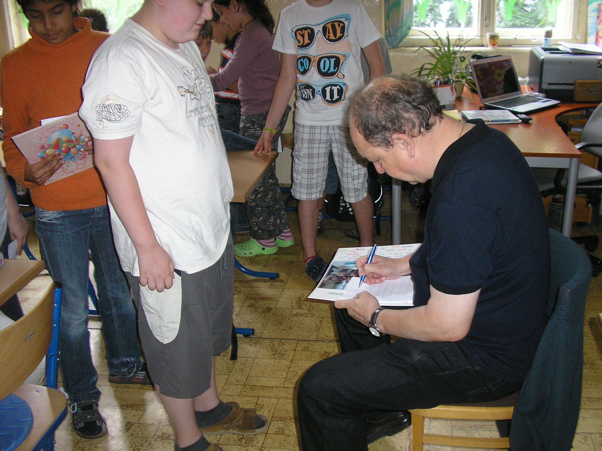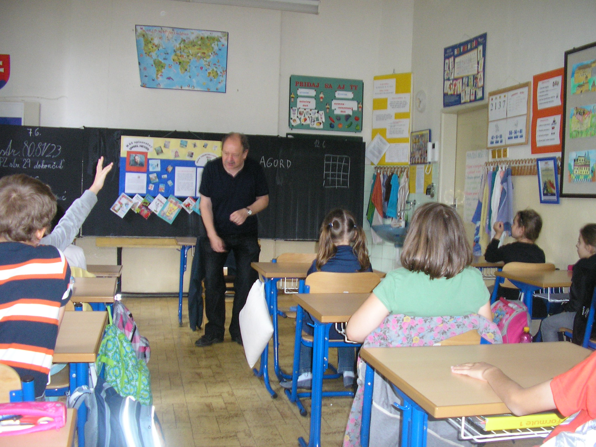 Stretli sme sa s naším spisovateľom Danielom Hevierom. Keď sme mu porozprávali o projekte „Náš spisovateľ“ , o našich pravidelných návštevách Mestskej knižnice a o vynikajúcich čitároch v našej triede, bol z toho nadšený.