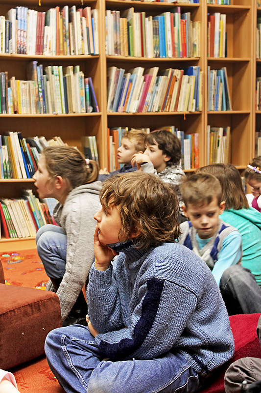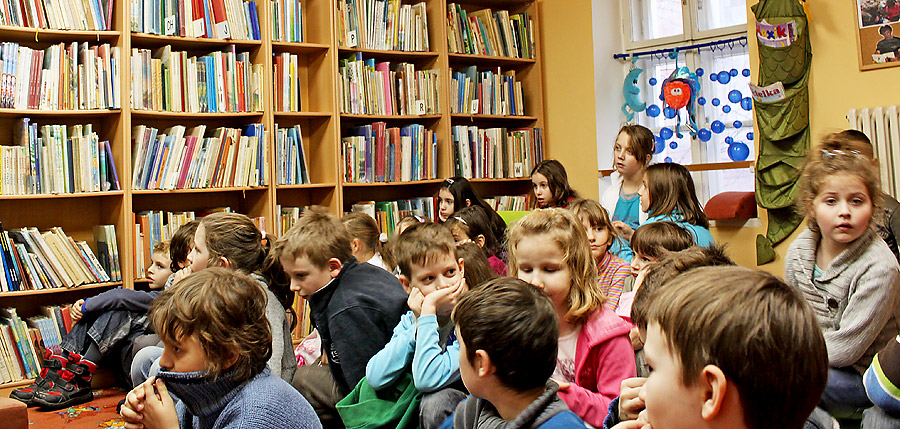 Deti z dramatického a čitateľského krúžku rady chodia na dramatizované čítanie do Mestskej knižnice.