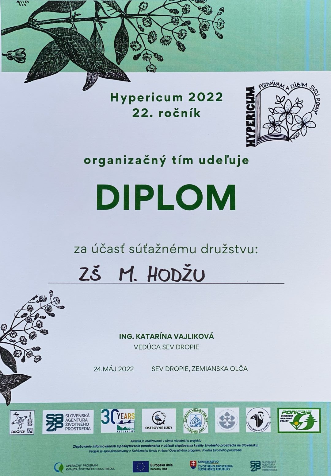 Hypericum je environmentálna pohybovo-vedomostná súťaž, ktorá sa uskutočnila 24.5. 2022 v Stredisku environmentálnej výchovy Dropie v Zemianskej Olči. Súťaže sa zúčastnil 3-členný tím – žiakov 2. stupňa základnej školy. Tím tvorili 2 žiačky 8. ročníka – Amálka a Barborka a jedna žiačka 9. ročníka – Alexandra.