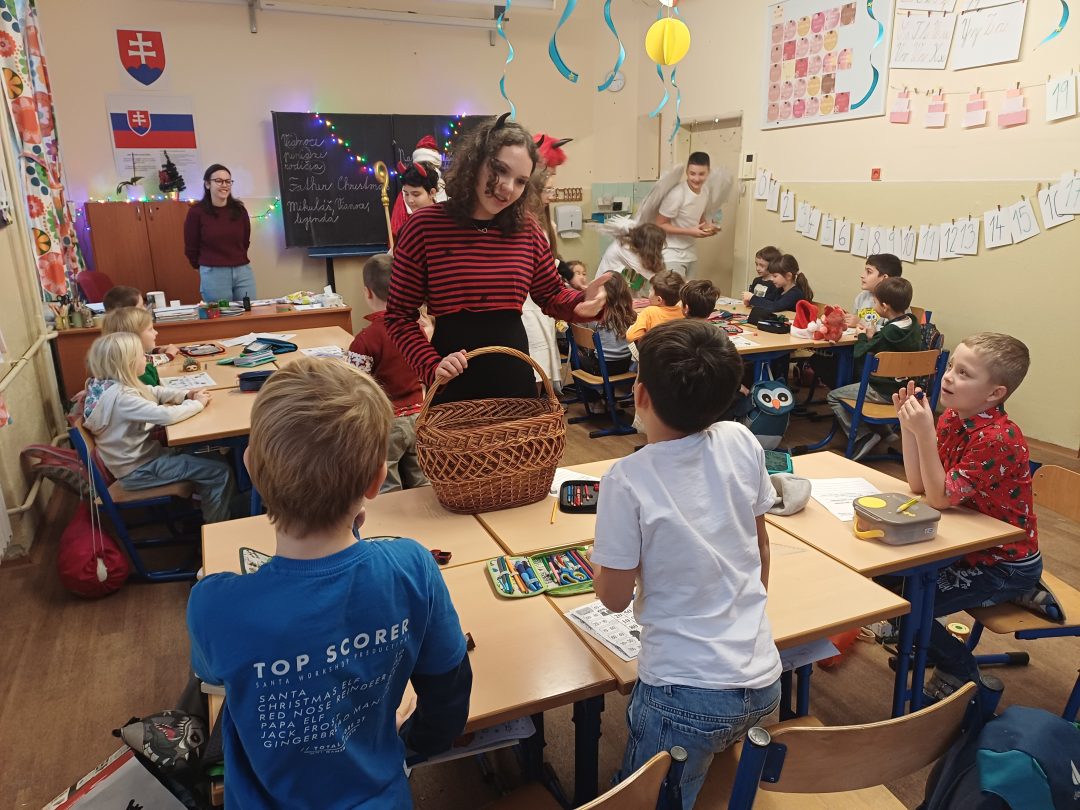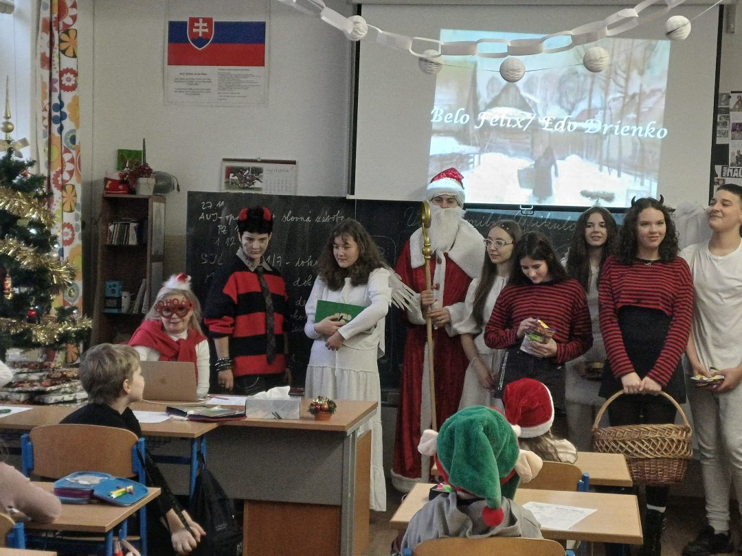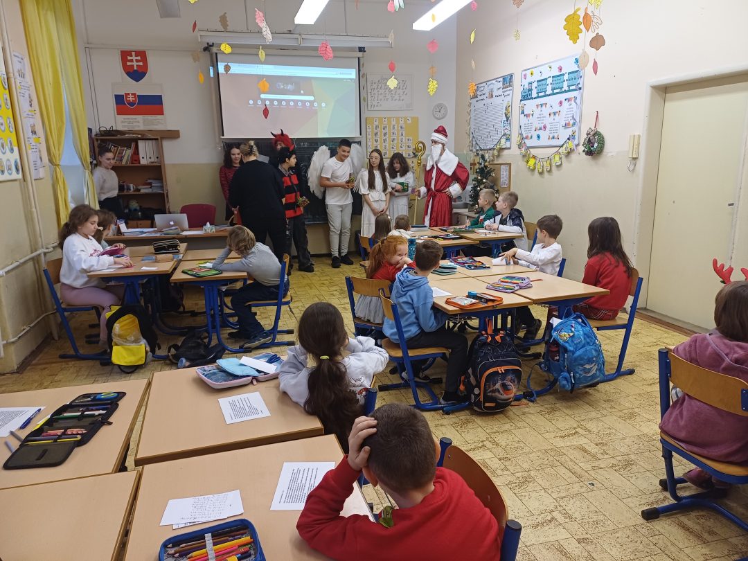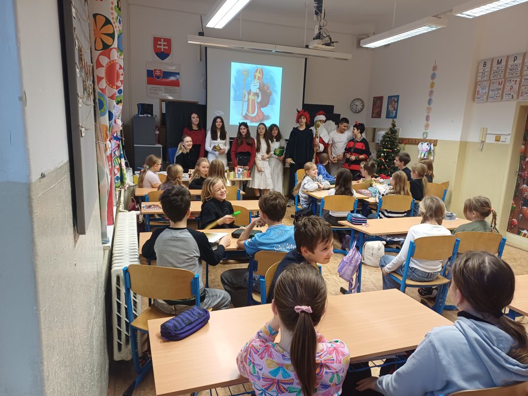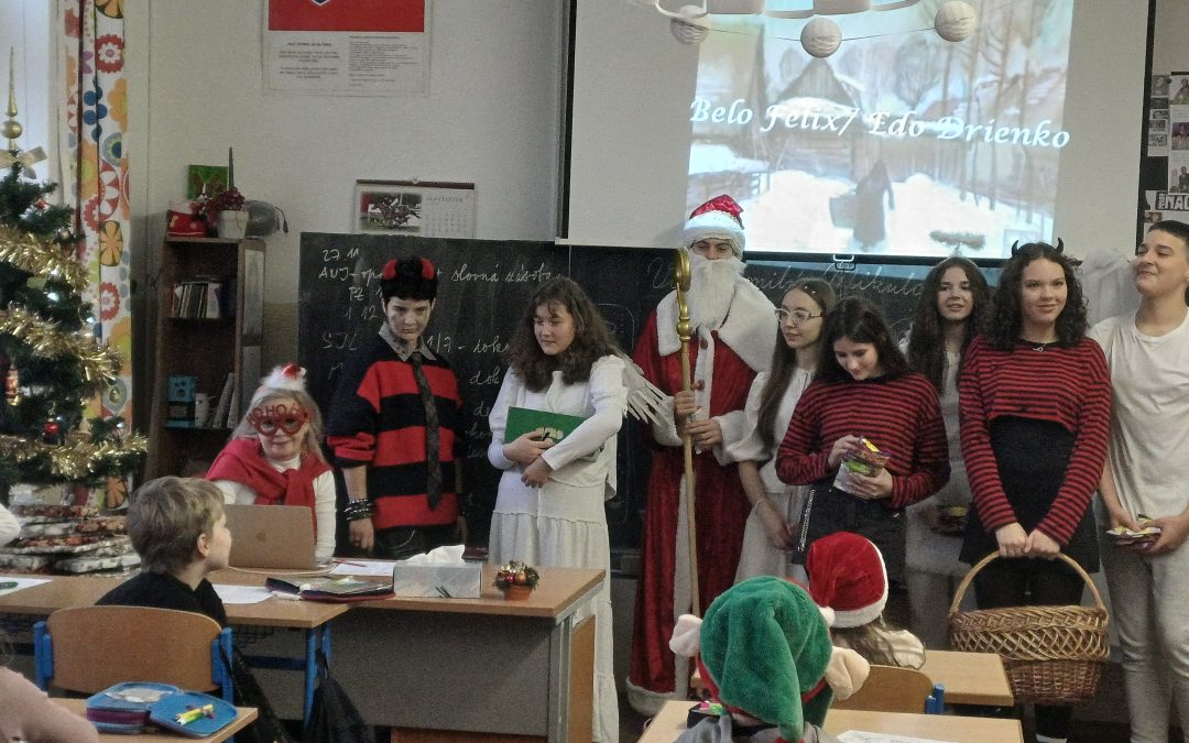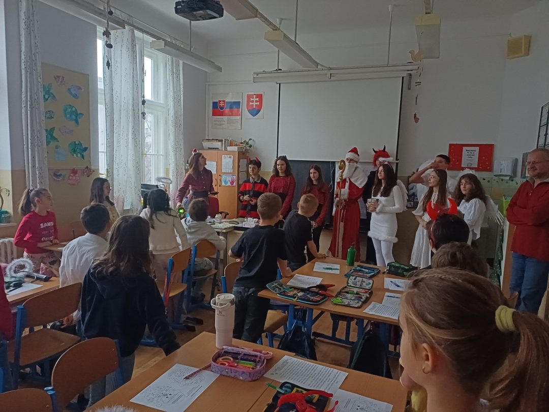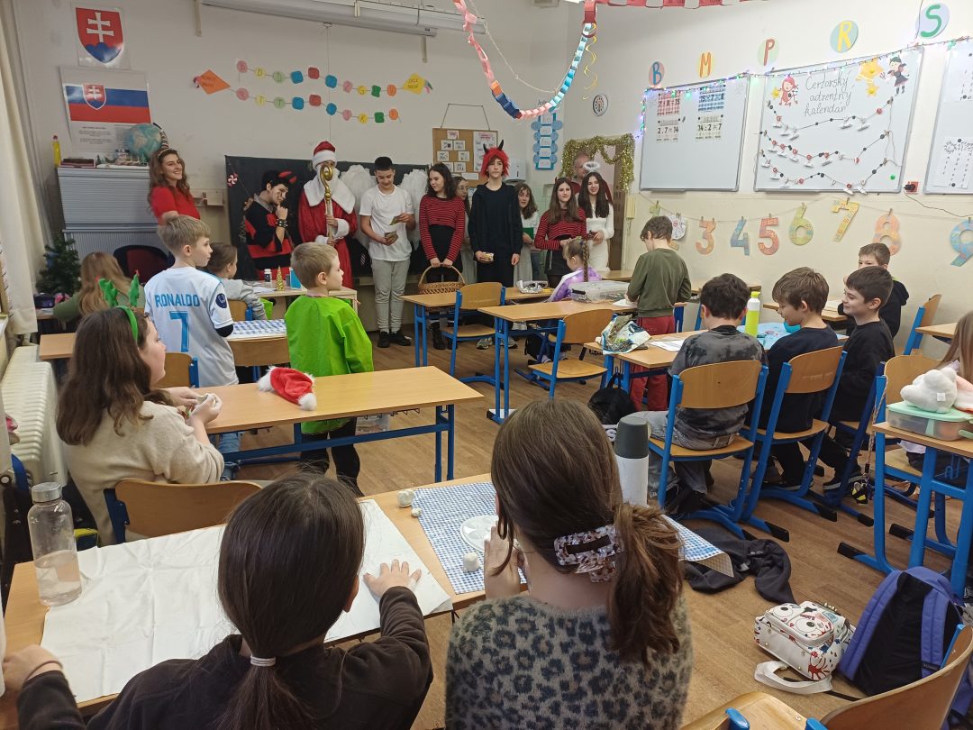 Na svätého Mikuláša, neučí sa, neskúša sa….a tak to bolo aj u nás v škole. Deti sa hravou formou dozvedeli o tom, kto je to Mikuláš, kde žil a prečo sa začala tradícia mikulášskych darčekov. Príjemné chvíľky v triedach prerušilo hlasné zabúchanie na dvere a v nich sa zjavila celá družina: Mikuláš, anjeli, ba aj čerti. Opýtali sa detí, či počas roka poslúchali a ony im zaspievali pesničky a zarecitovali básničky. Za odmenu im Mikuláš rozdal sladkosti.