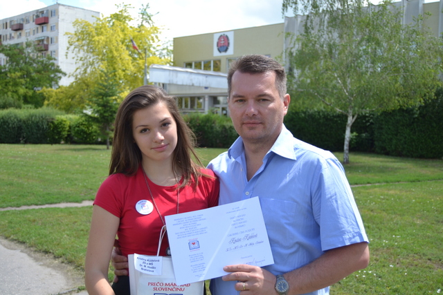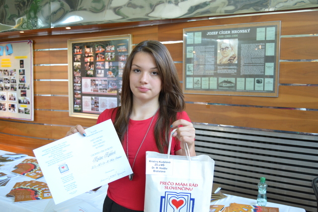 Žiačka VIII.B Kristína Kúdelová získala v súťaži Prečo mám rád slovenčinu, prečo mám rád Slovensko so svojou básňou osobitnú cenu poroty.