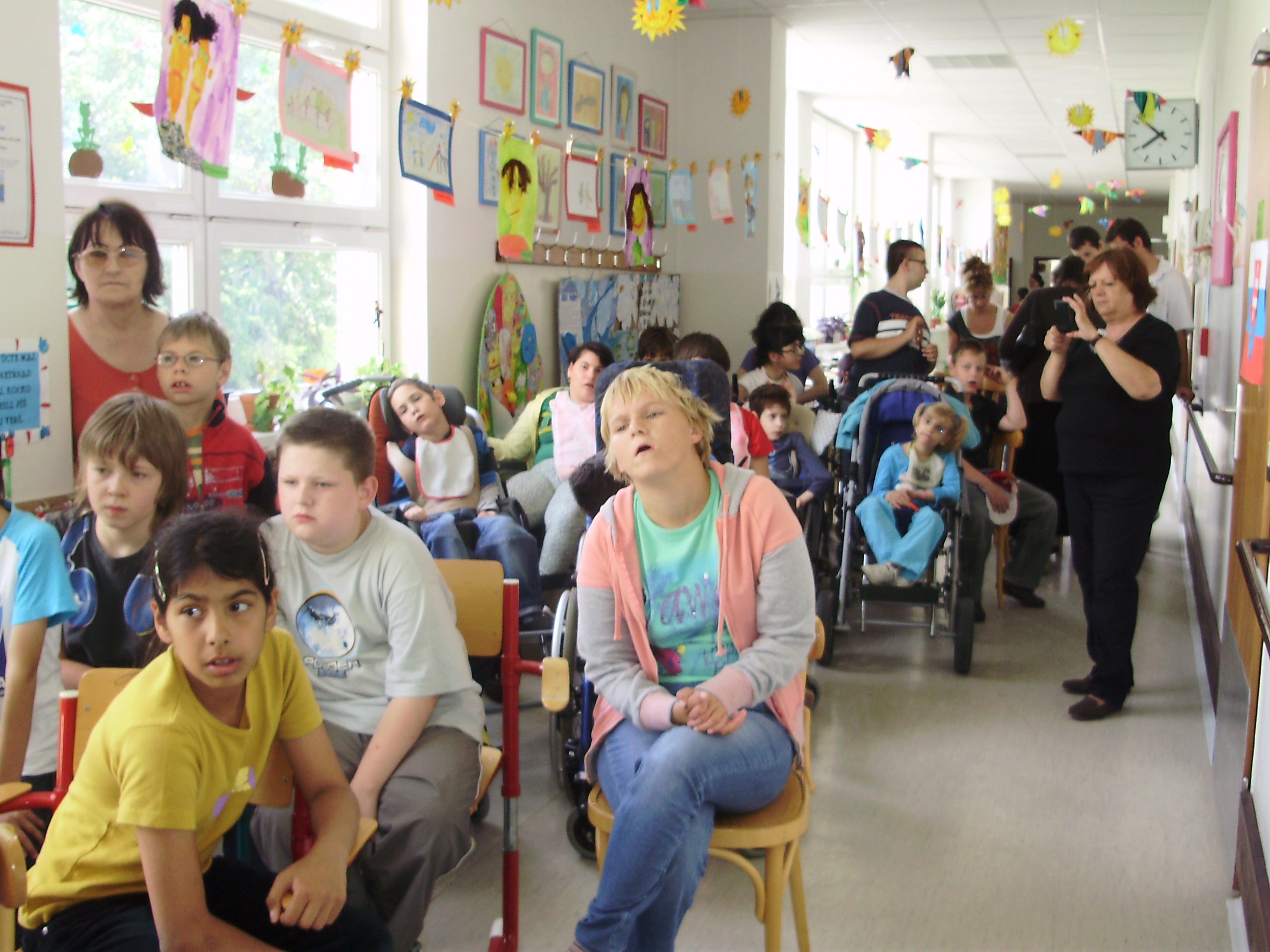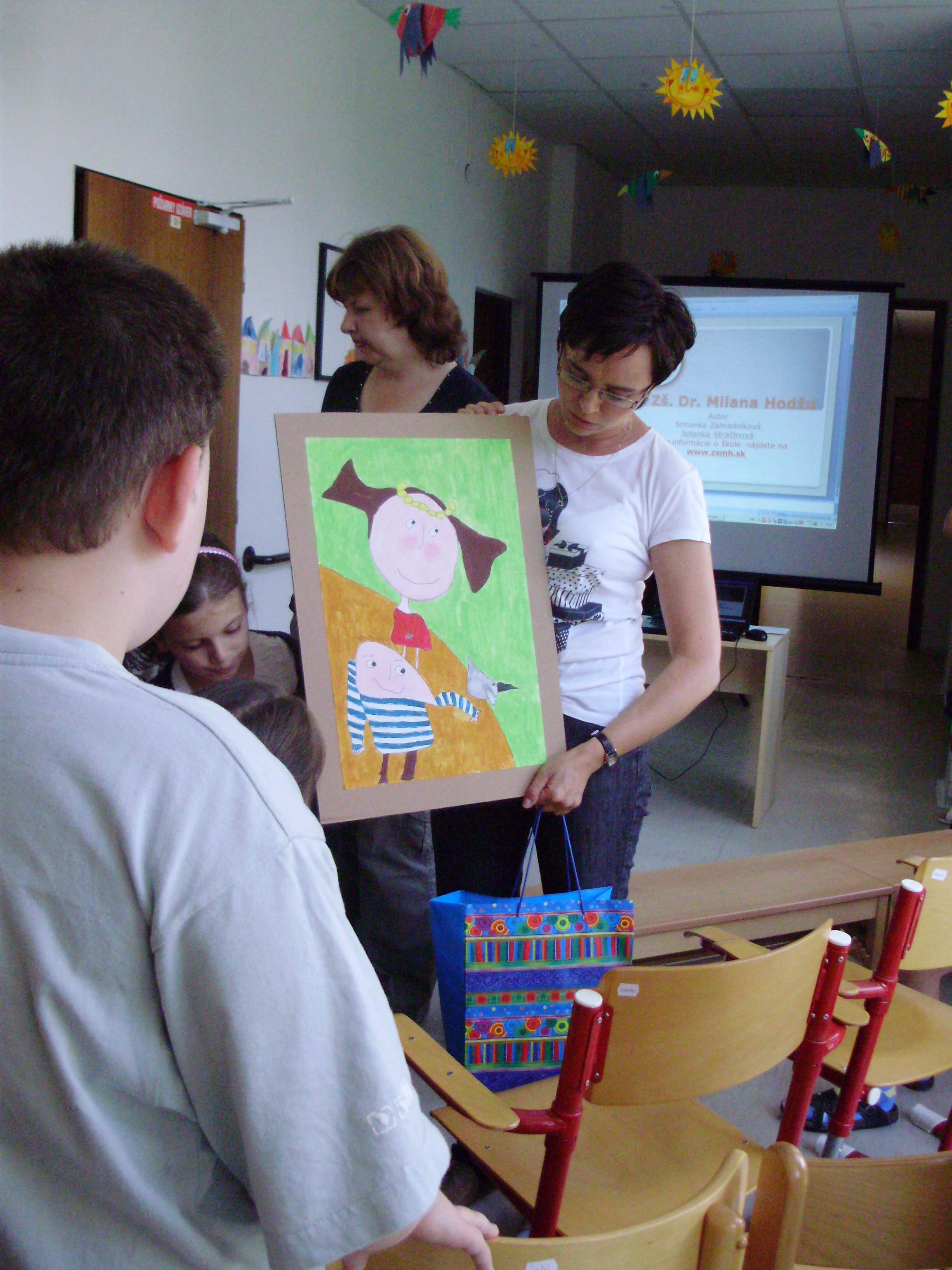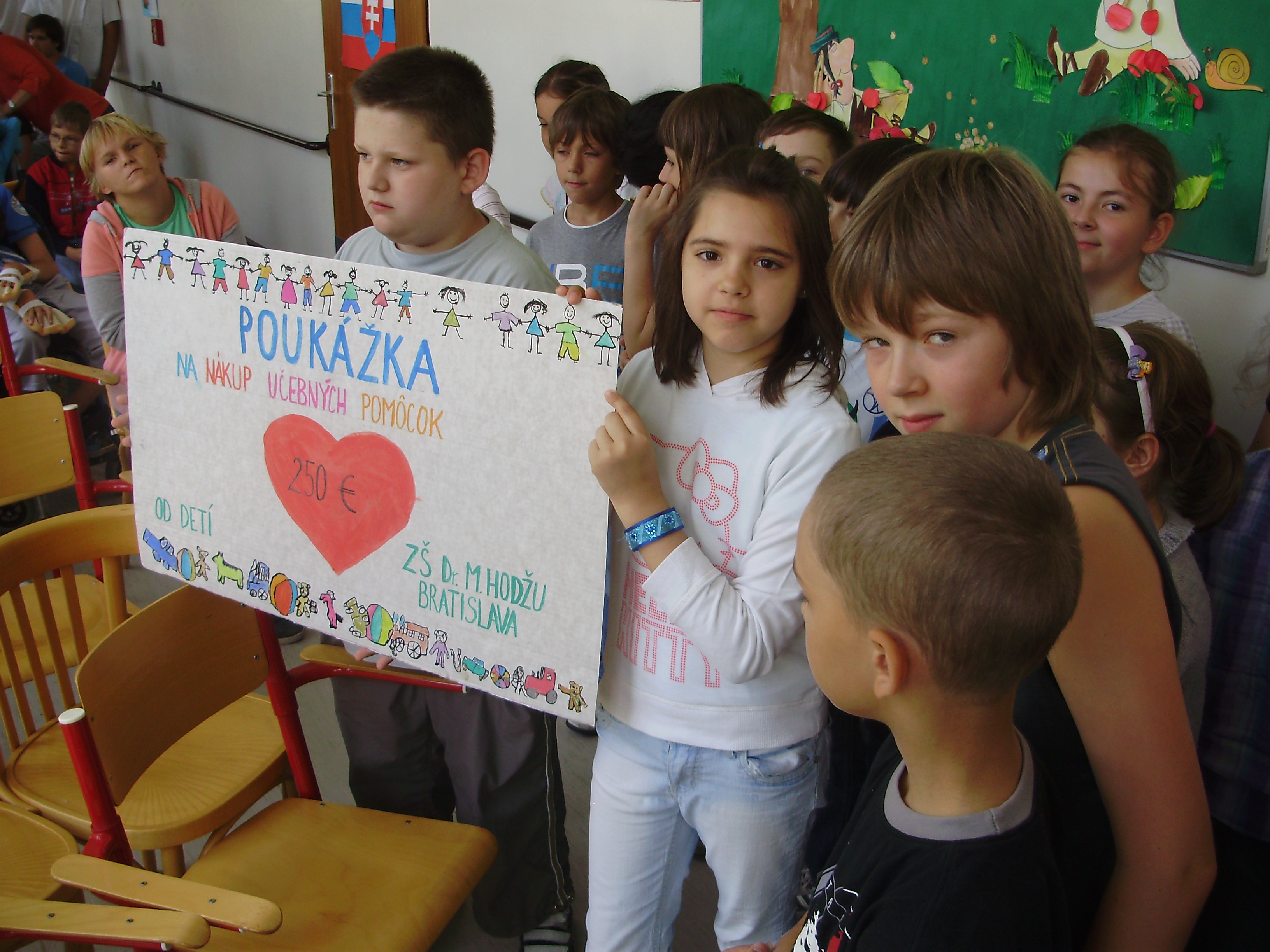 Naši tretiaci sa teda opäť vybrali na návštevu. Spoločné stretnutie začalo elektronickou prezentáciou našej školy, ktorou sme im chceli priblížiť život v nej. Potom naše deti slávnostne odovzdali svojim handicapovaným kamarátom symbolickú poukážku v hodnote 250 €. Tieto peniažky deti 1. stupňa zarobili na burze počas MDD. Ako poďakovanie sme dostali krásne výtvarné dielko, ktoré nám bude pripomínať túto výnimočnú udalosť. Všetkým deťom prvého stupňa patrí veľká vďaka.