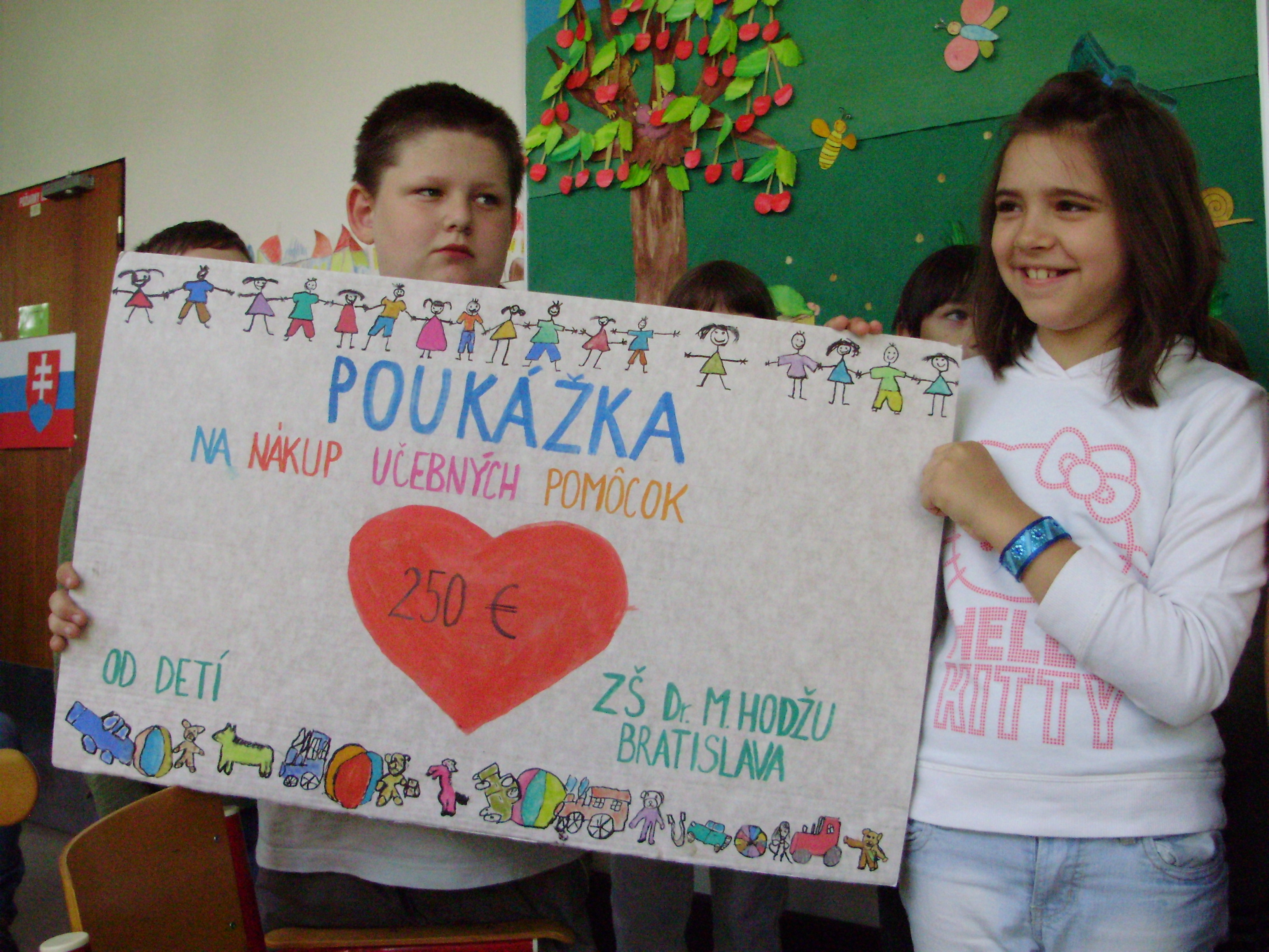 Už tretí rok spolupracujeme so Spojenou školou na Dúbravskej ceste 1. Tento rok sme chceli urobiť deťom z Dúbravskej cesty radosť, a preto sme sa rozhodli venovať im po dohode s našimi deťmi finančný zisk z detskej burzy na nákup učebných pomôcok.