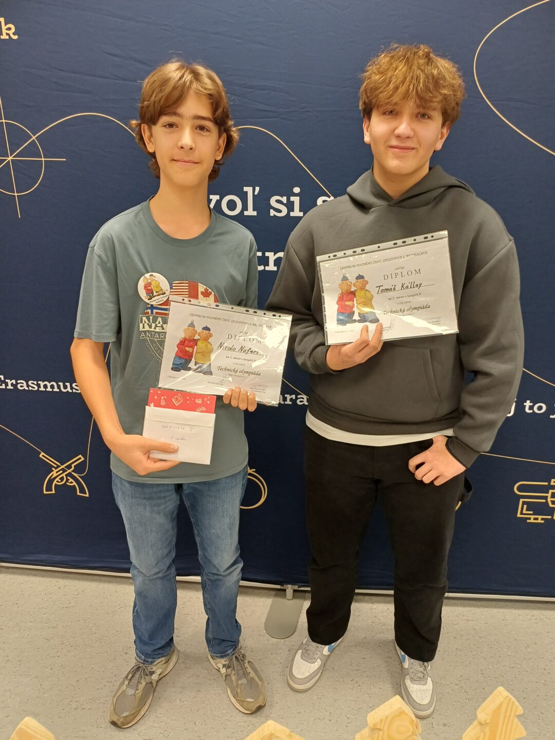 Naši šikovní deviataci Tomáš Kállay a Nicolo Noferi mimoriadne úspešne reprezentovali našu školu a v okresnom kole Technickej olympiády zvíťazili v kategórii A (starší žiaci). V tejto kategórii súťažili dvojice žiakov v teoretickej a praktickej časti. Naši žiaci po úspešnom vypracovaní teoretického testu presvedčili porotu o svojom prvenstve aj praktickým výtvorom. Ich úlohou bolo zhotoviť podľa technického výkresu výrobok – drevený vešiak.