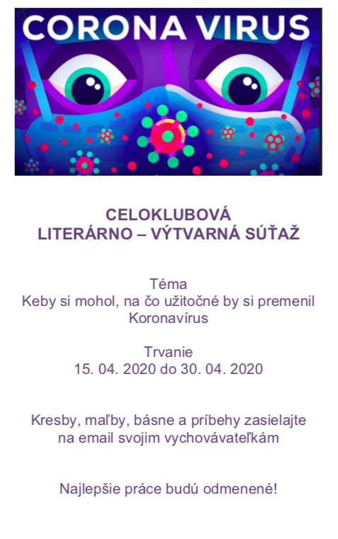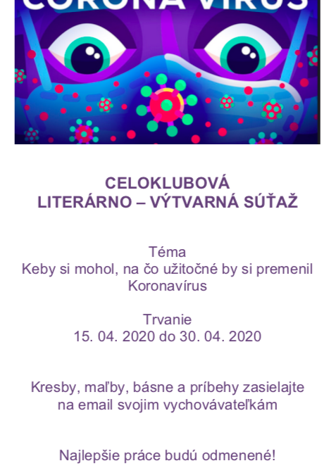 Vychovávatelia zorganizovali literárno-výtvarnú súťaž Letáčik, v ktorej mali deti zapojiť svoju fantáziu a vymyslieť, na čo užitočné by zmenili coronavírus. Ich fantastické výtvory sú vystavené v priestoroch prvého stupňa našej školy. Ďakujeme všetkým deťom, ktoré sa do súťaže zapojili.