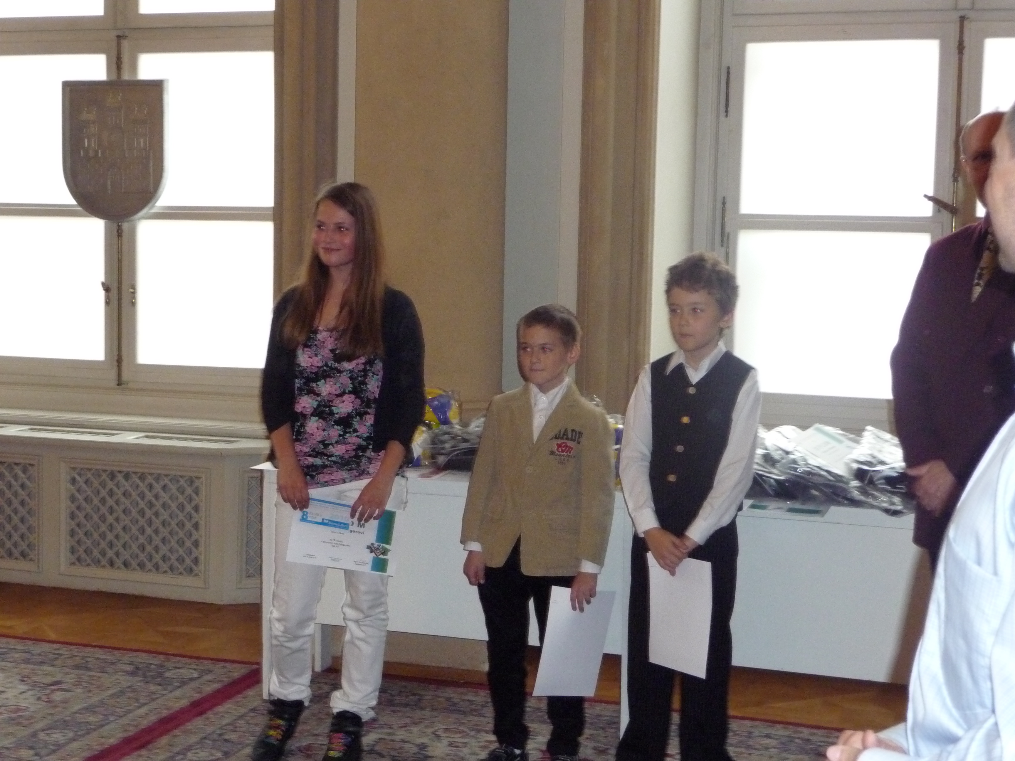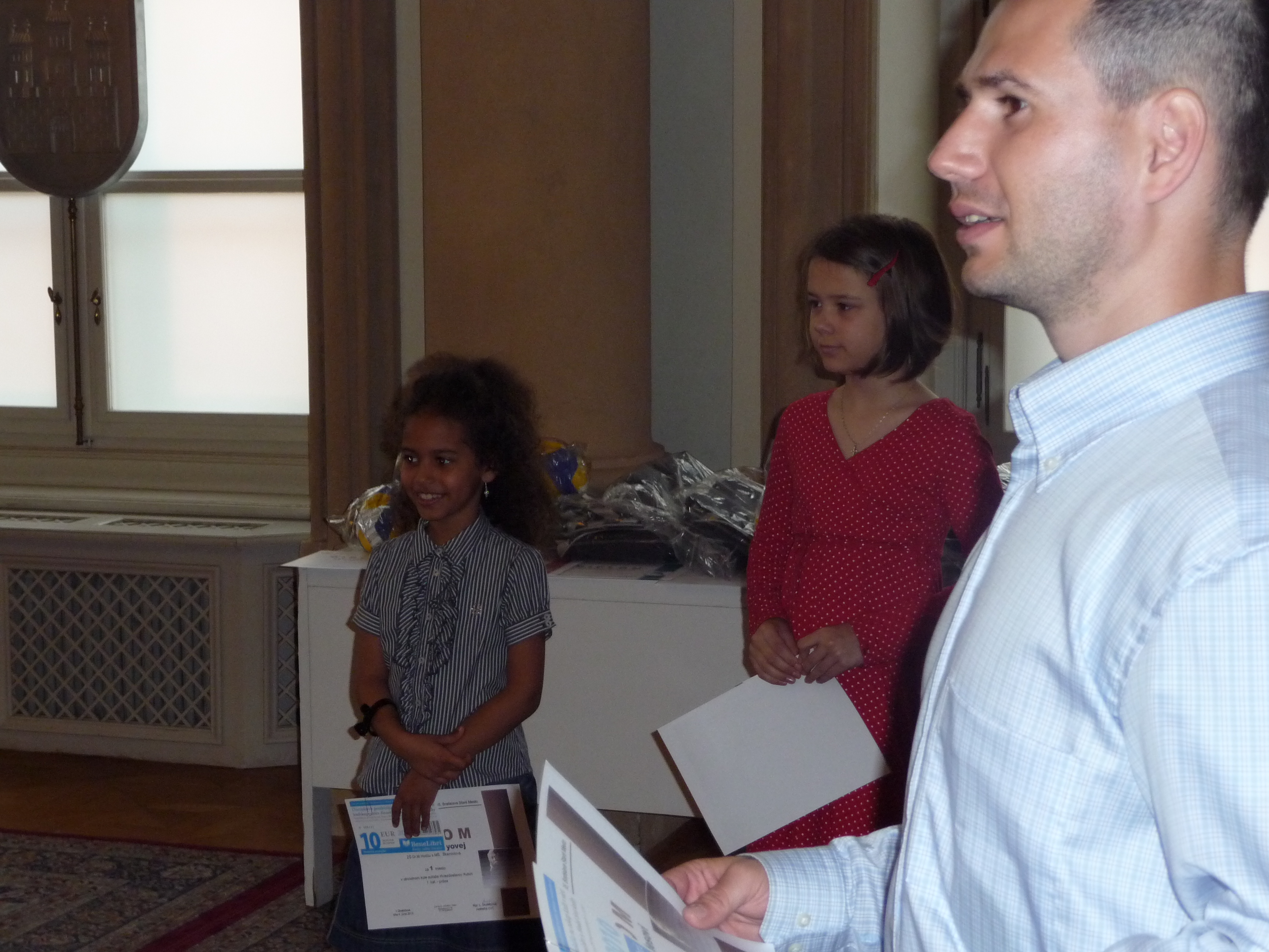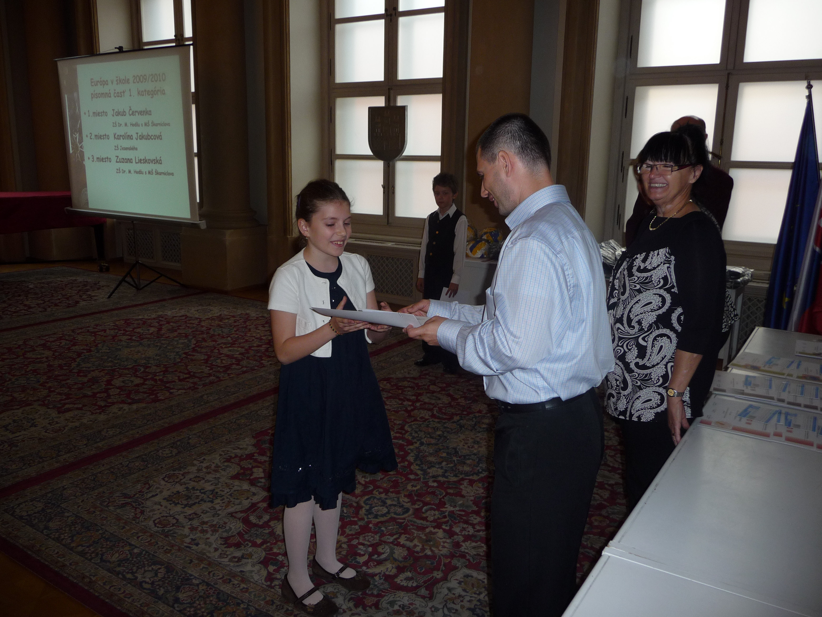 Ceny a diplomy deťom odovzdali hostia – páni M. Jančát a  I. Mariančík z KŠÚ a pani Soňa Budincová z oddelenia školstva MÚ MČ Bratislava – Staré Mesto.
