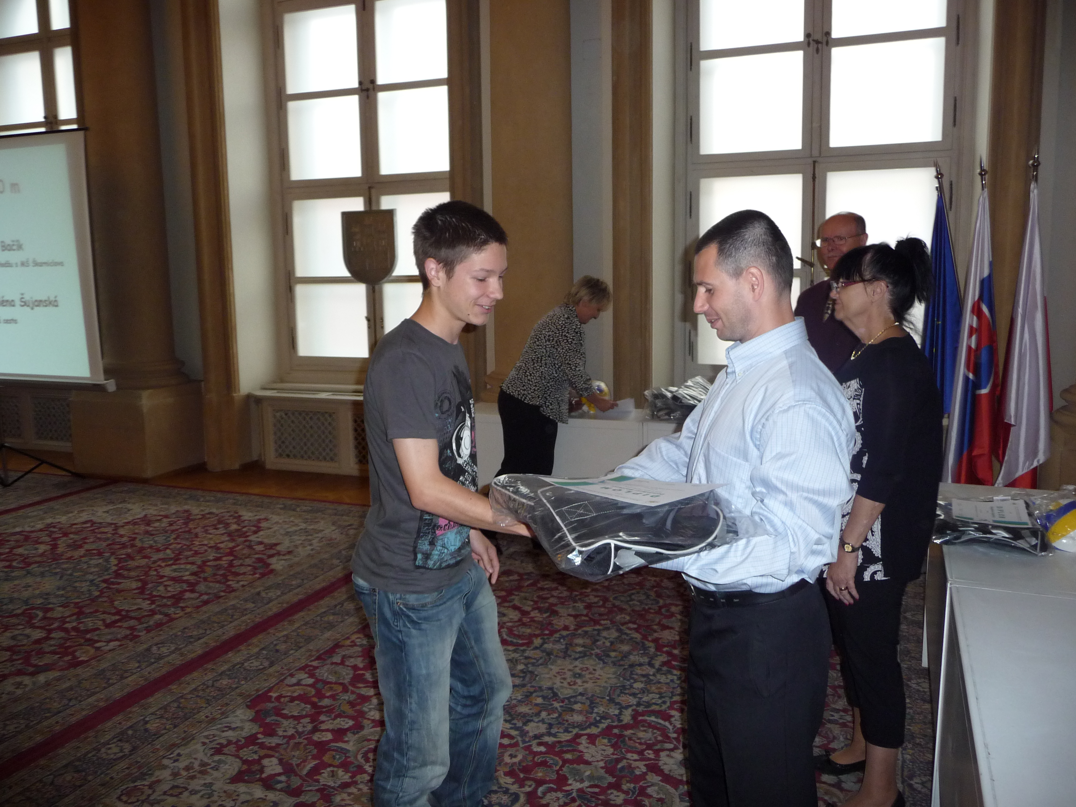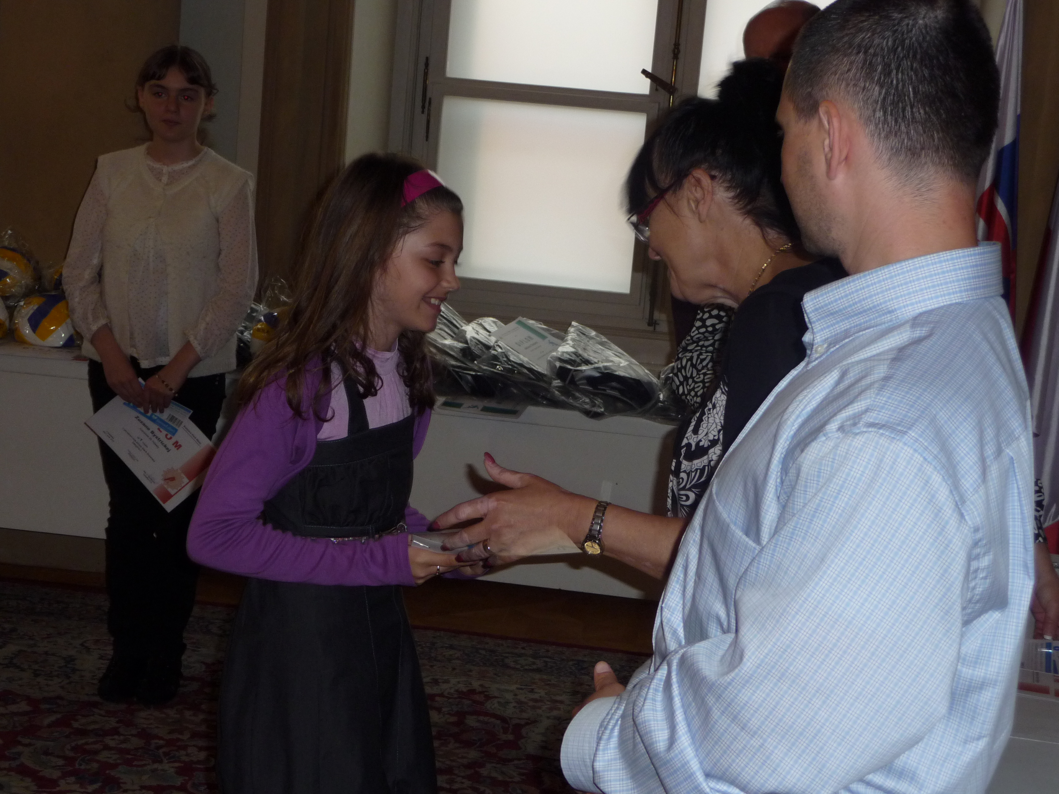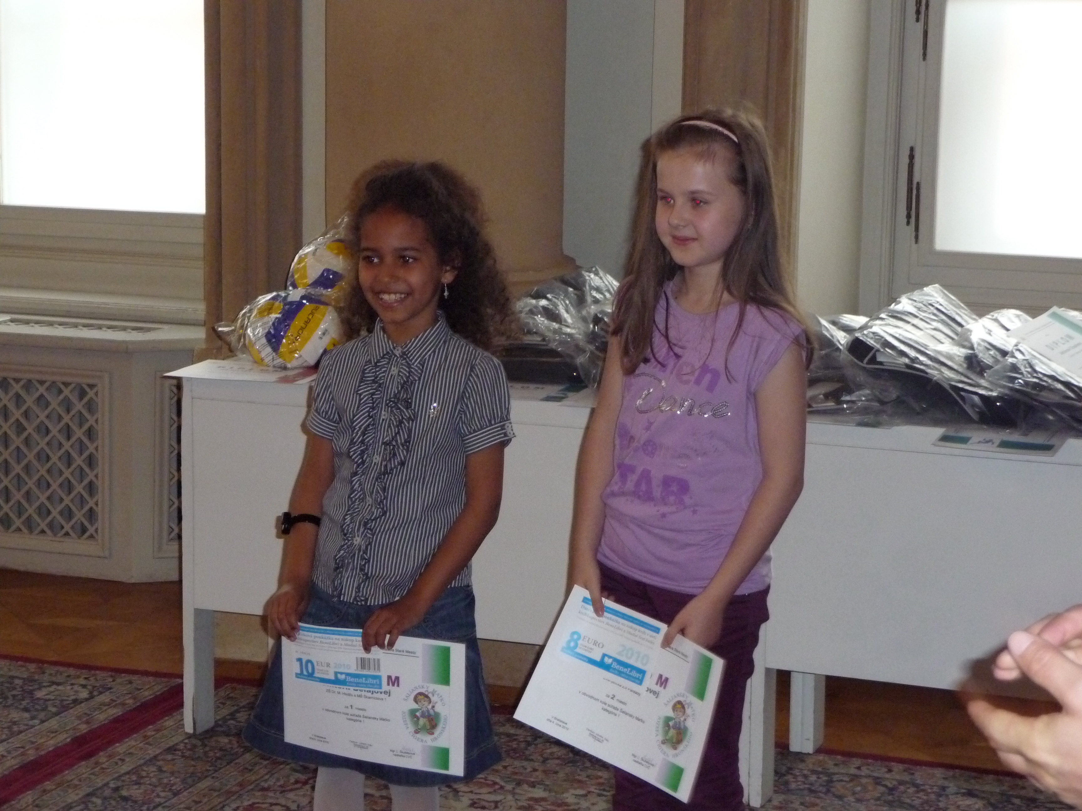 Ceny a diplomy deťom odovzdali hostia – páni M. Jančát a  I. Mariančík z KŠÚ a pani Soňa Budincová z oddelenia školstva MÚ MČ Bratislava – Staré Mesto.