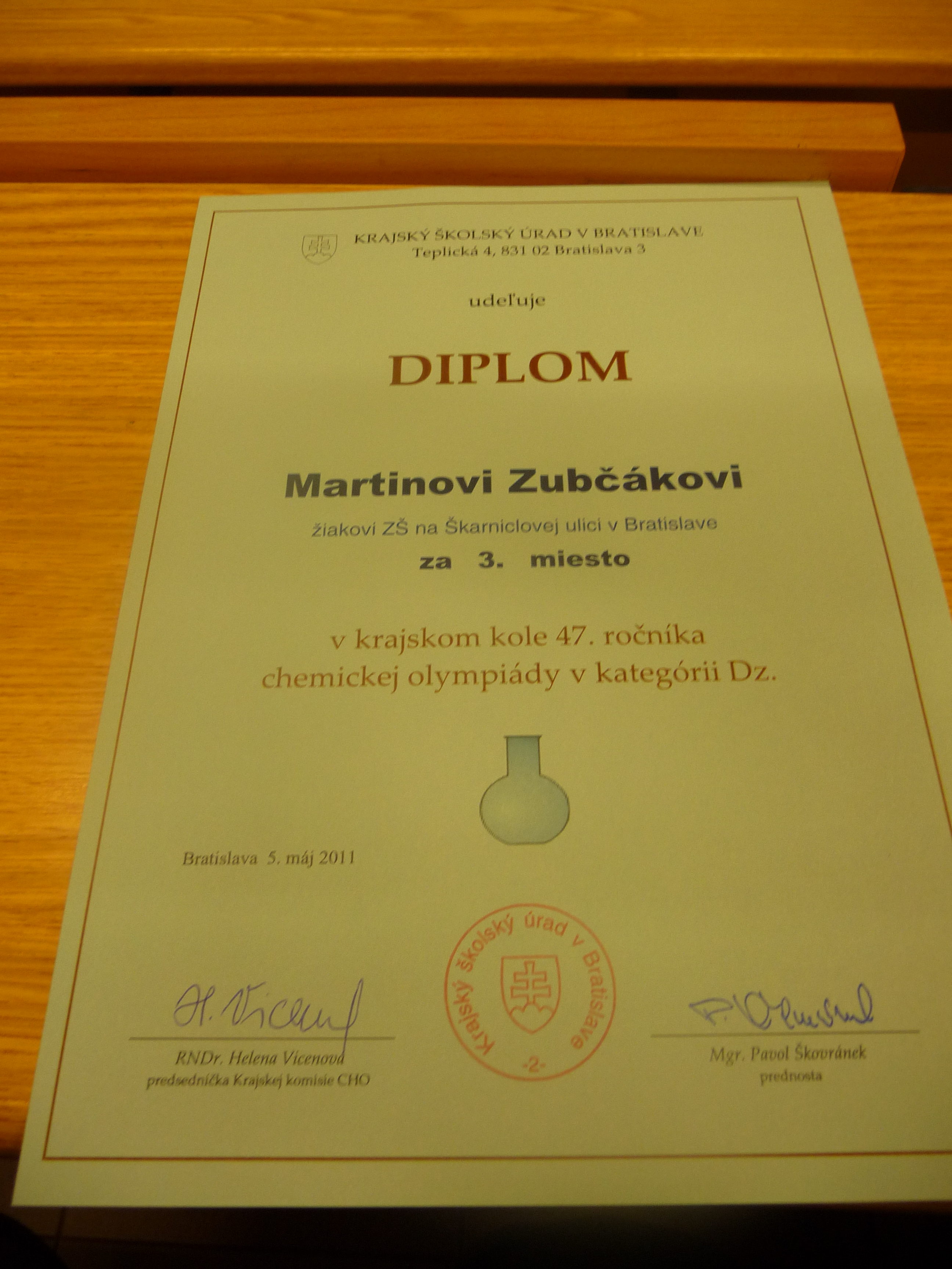 Žiaci našej školy, Martin Zubčák a Michal Šturc sa zúčastnili na slávnostnom odovzdávaní cien za úspešné riešenia najvyššieho možného stupňa chemickej olympiády pre žiakov základných škôl – krajského kola. Martin Zubčák z IX. A sa umiestnil na treťom mieste a Michal Šturc z IX. B na siedmom mieste.