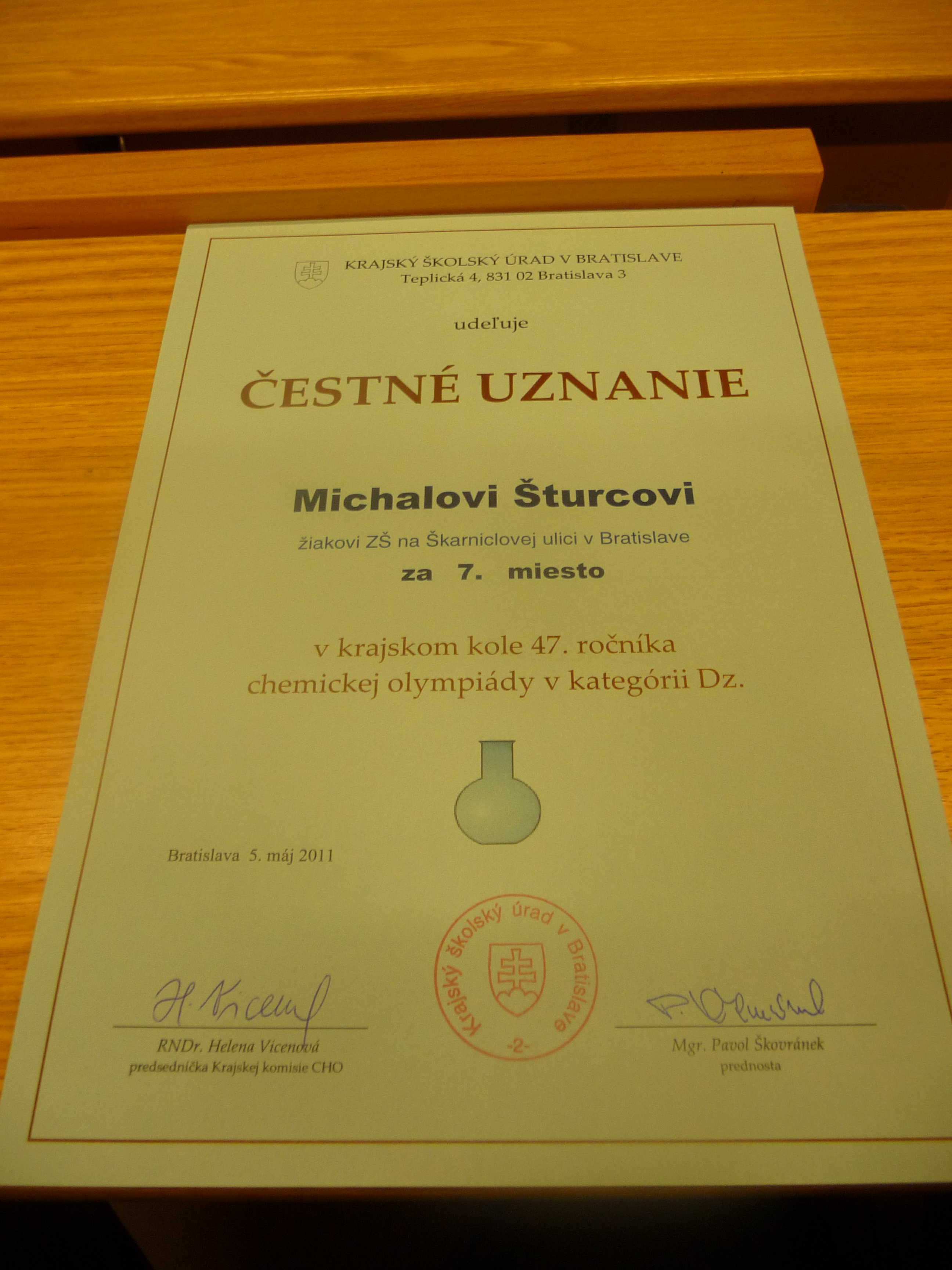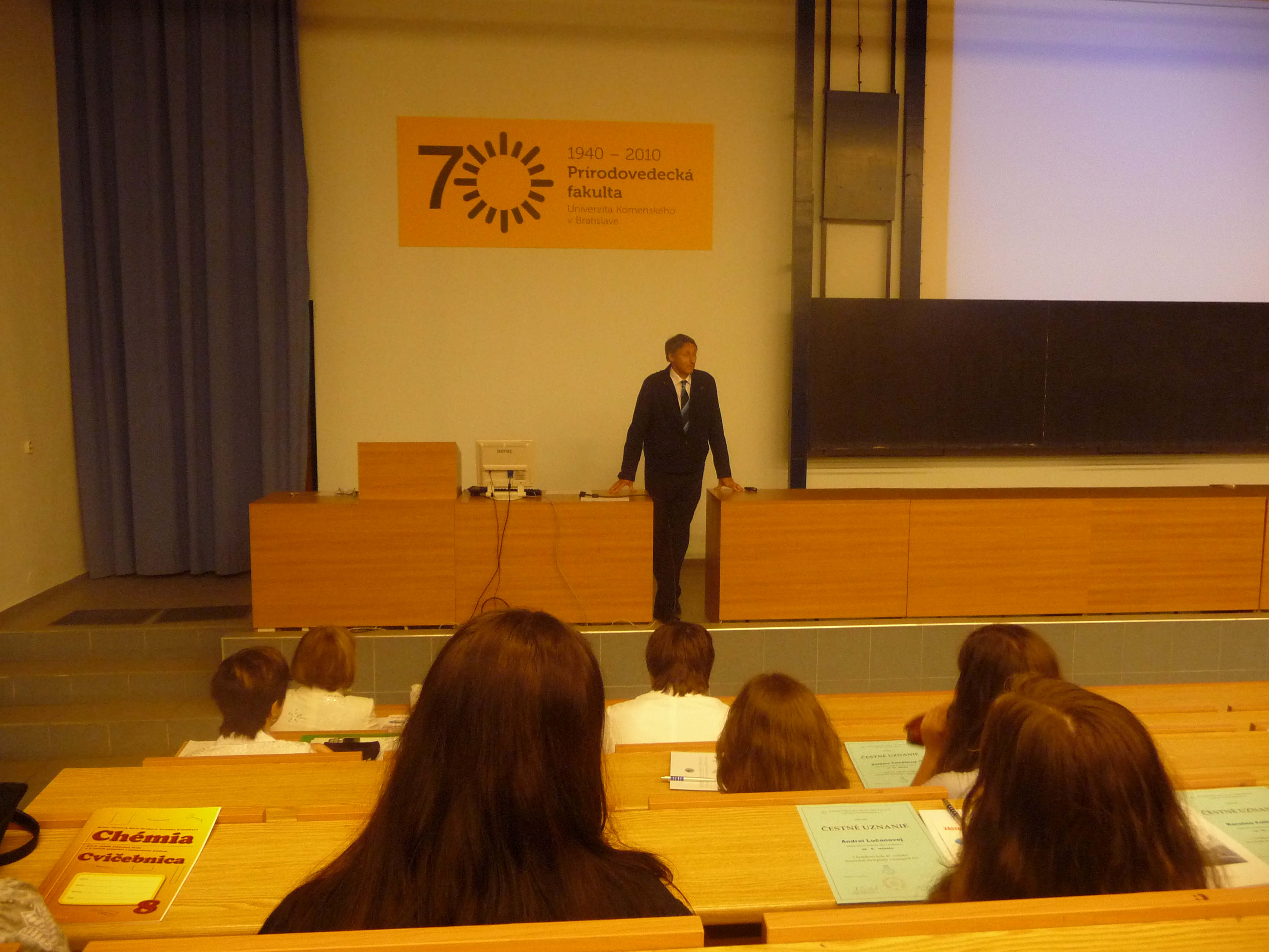 Žiaci si prebrali ocenenia z rúk autorky učebníc chémie a súťažných zadaní z chemickej olympiády RNDr. Heleny Vicenovej priamo na pôde Prírodovedeckej fakulty UK v Bratislave. Ocenenie bolo obohatené zábavnou prednáškou z odboru „Alternatívna chémia“, ktorú prezentoval Ing.Karol Jesenák, PhD. Poučná bola aj prehliadka laboratórií, ktorá našim žiakom predstavila chémiu ako vedu, ktorú možno študovať aj zábavnou formou. Za dosiahnuté výsledky našim deviatakom ďakujeme.
