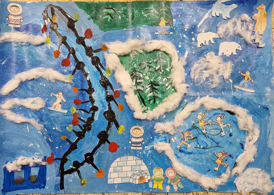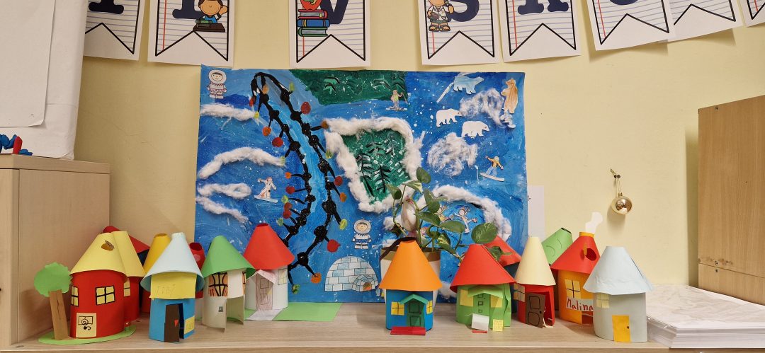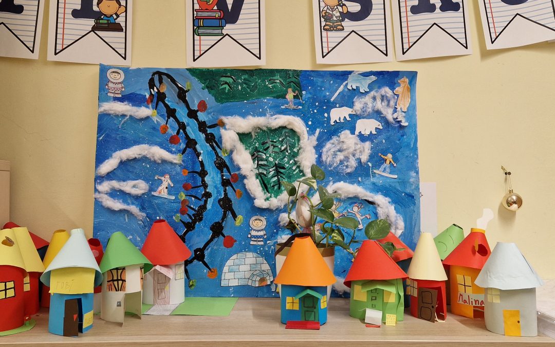 Tuhá zima a snehové záveje sú v Bratislave v poslednej dobe veľmi vzácne, a preto si deti z 3.A v čase ŠKD preniesli zimnú atmosféru do triedy. Rozprávali o zime, zimných športoch, ale aj eskimákoch a ľadových medveďoch. Nezabudli na zážitky zo zimných prázdnin, kde nechýbal sneh a lyžovačka. Keďže sa chceli podeliť so svojimi zážitkami s celou školou, vzali farby a štetce a všetko namaľovali.